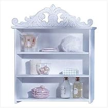 Showcase your sentimental keepsakes in genteel Victorian style! White wood unit with curvy carved crown has three spacious shelves to hold tons of treasures. (Contents not included.) 16 3/4" x 5 1/2" x 21 1/4" high.